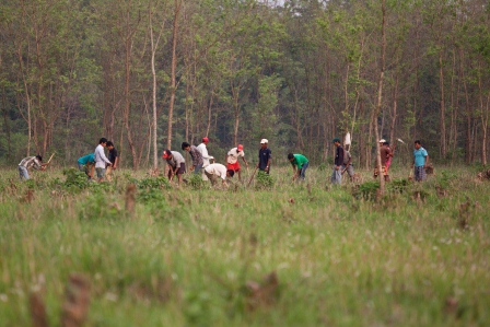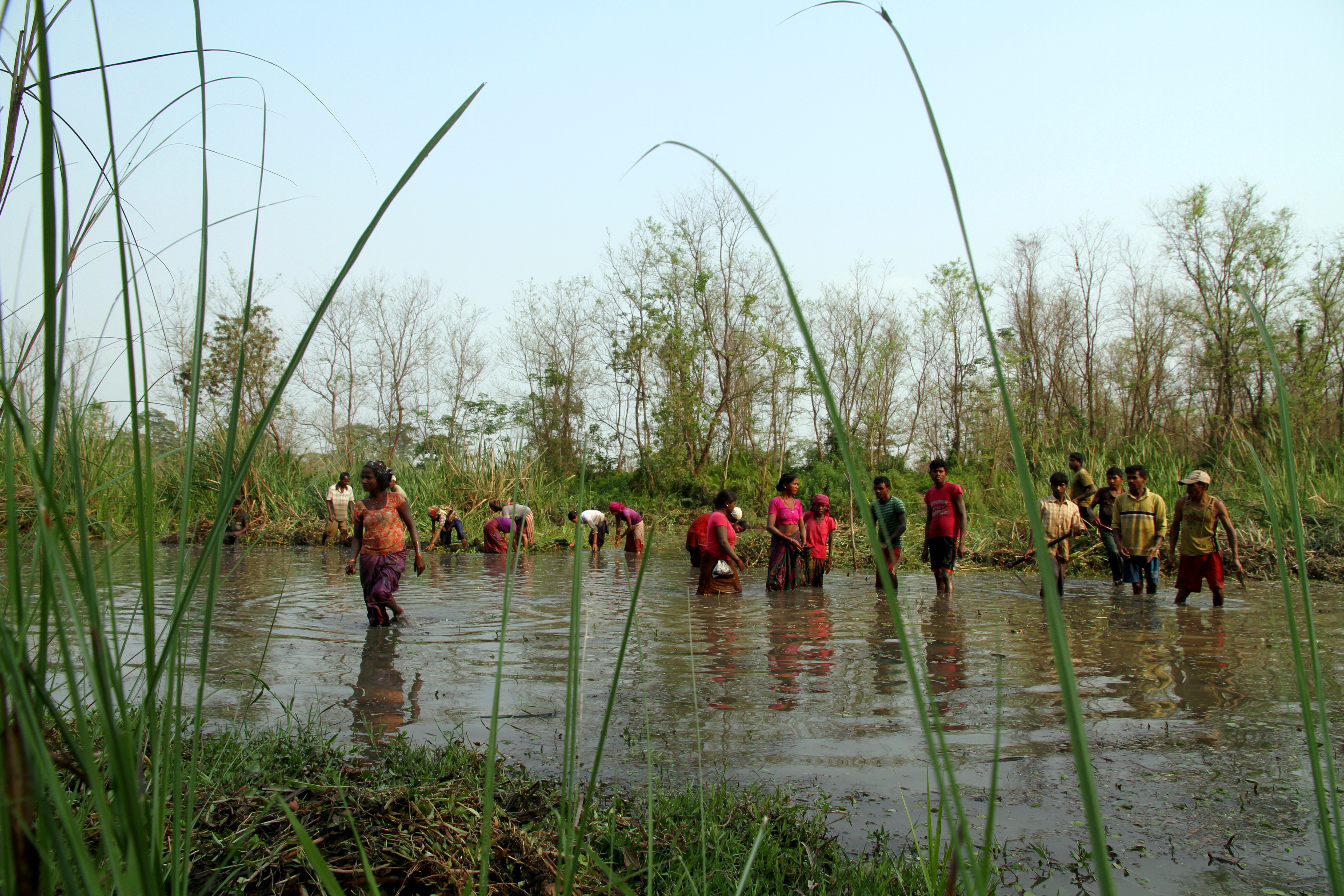 The degradation of wetlands and grasslands is a matter of grave concern for environmentalists, both in Nepal and across the globe. Dr. Shant Raj Jnawali, the Hariyo Ban Program Biodiversity Coordinator for WWF Nepal explains: “Species such as rhino and hog deer need access to alluvial tall flooded grassland in order to survive, whereas wetlands are essential for cultivation, irrigation and flood control.” He also links healthy wetlands to healthy livelihoods. “Wetlands also have recreational, religious and cultural value,” says Dr. Jnawali, “they have the potential to draw tourists and to boost local livelihoods.” Clearly, the effective management of grasslands and wetlands has a significant positive impact on the maintenance of ecological harmony. We witnessed wetlands management in action in the Namuna Buffer Zone Community Forest in Amaltari, Nawalparasi district, where twenty-five men and women were working to clear dense water hyacinth and water cabbage growth from a small section of the Sano Narayani (known locally as Bhutaha Dhaab). Originally a river, the water source has become severely depleted, and is now little more than a pond. Dr. Jnawali explains: “Threats such as siltation, encroachment, overexploitation of resources, invasive alien plant species and pollution are responsible for the degradation of our wetlands and the destruction of the habitats and water sources for our wildlife.” Dr Jnawali goes on to say that the degradation of grasslands is caused by overgrazing, encroachment, invasive alien plants, and uncontrolled or mistimed burning.