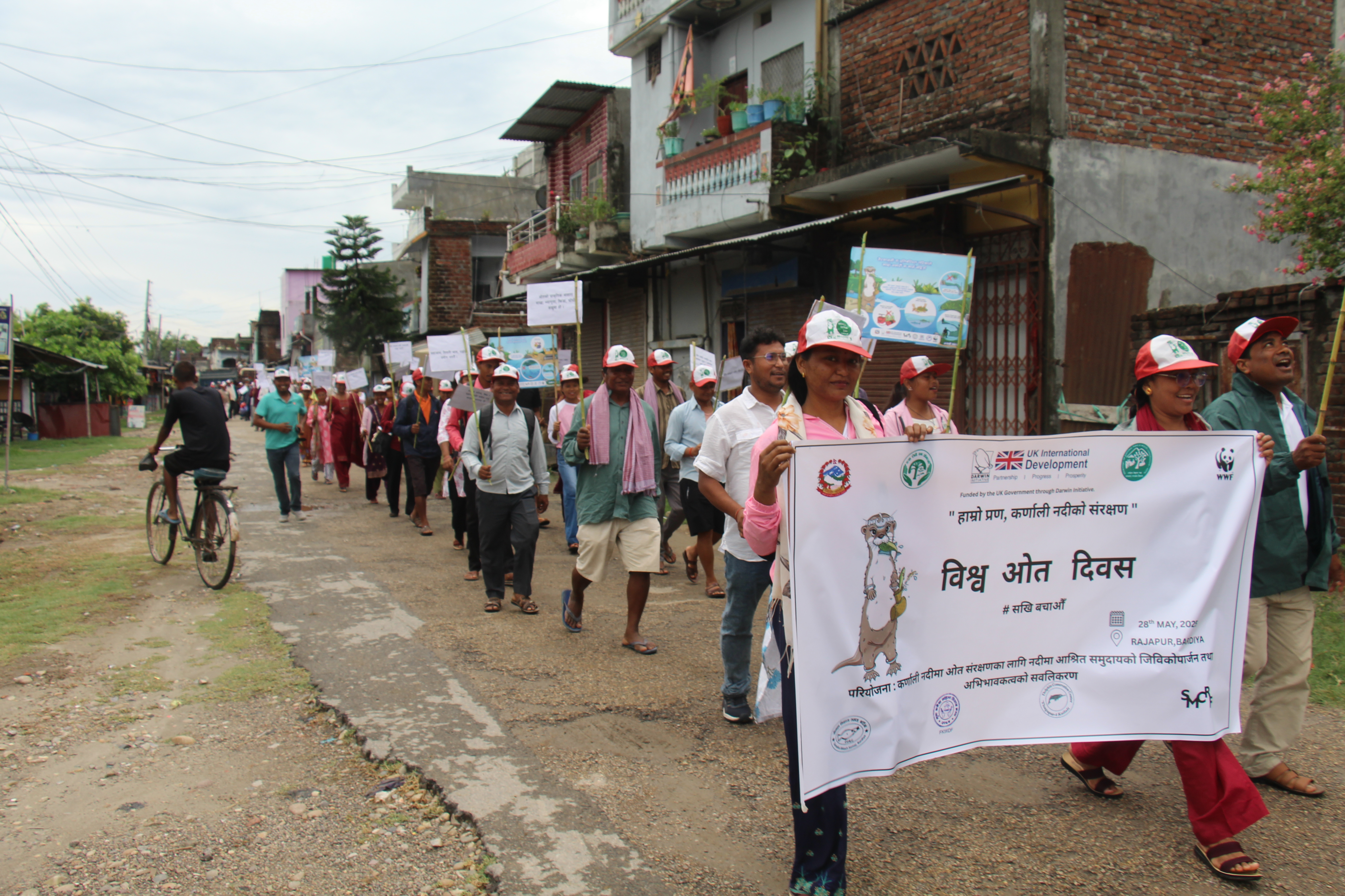 Rajapur, Bardiya – May 28, 2025: World Otter Day was celebrated in Rajapur-1,Bardiya by WWF Nepal in collaboration with the Government of Nepal. The event was organized by implementing partners Sonaha Bikas Samaj (SBS), Freed Kamaiya Women Development Forum (FKWDF), Dolphin Conservation Centre (DCC), and Small Mammal Conservation and Research Foundation (SMCRF). The celebration highlighted the importance of otters, the threats they face, and the urgent need for habitat management and conservation.The event featured a rally through the town, where participants carried banners and chanted slogans to raise awareness about the urgent need to conserve otters, their riverine habitats, and prey base. The rally was preceded by an awareness session covering the basics of “What is an Otter?”, its ecological importance, the threats to its survival, and how communities can contribute to its protection. Around 70 participants gathered in Rajapur-3, Bardiya, uniting local communities, stakeholders, youth groups, and government representatives in a joint effort to promote awareness of otters and their significance in freshwater ecosystems.